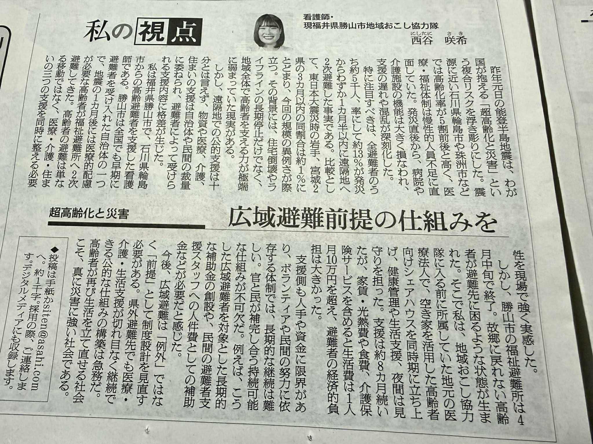 朝日新聞の私の視点にキャンナス勝山の代表西谷さんが